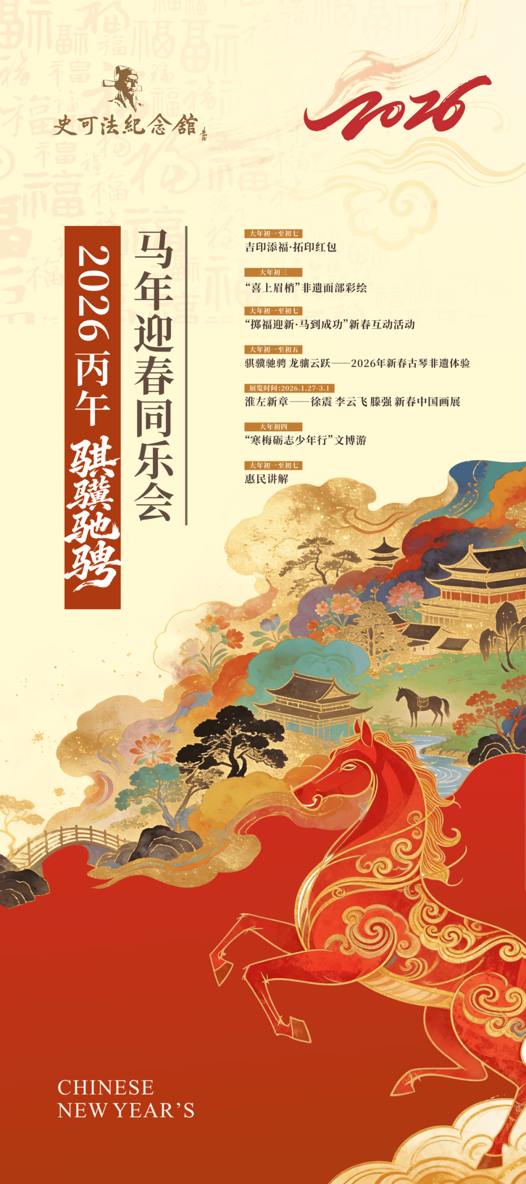 内容:举办“2026‘骏马踏新程·国潮贺新春’马年送新同乐会”系列勾当,打制日夜联动的沉浸式文旅勾当。非遗市集:面部彩绘、DIY糖画制做、投壶、剪纸、打卡盖印、写福字送祝愿等勾当。